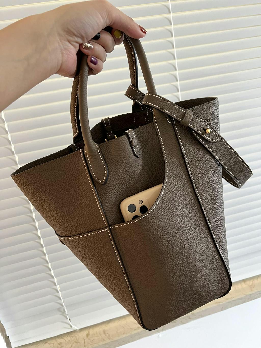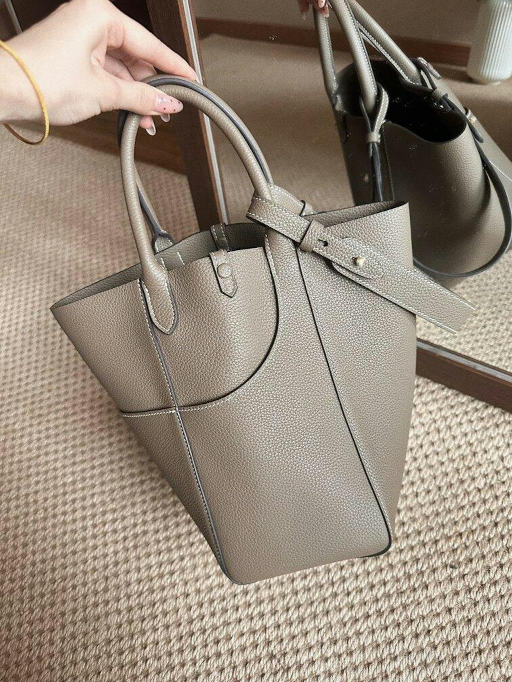 The design of this leather bucket bag is inspired by the phoenix crown and cloak shape of the wedding dress in the Song Dynasty, which perfectly interprets the combination of modern fashion and traditional style. This versatile tote bucket bag is crafted from top-grain Togo lychee leather and hand-stitched with waxed thread. The leather feels soft and comfortable.