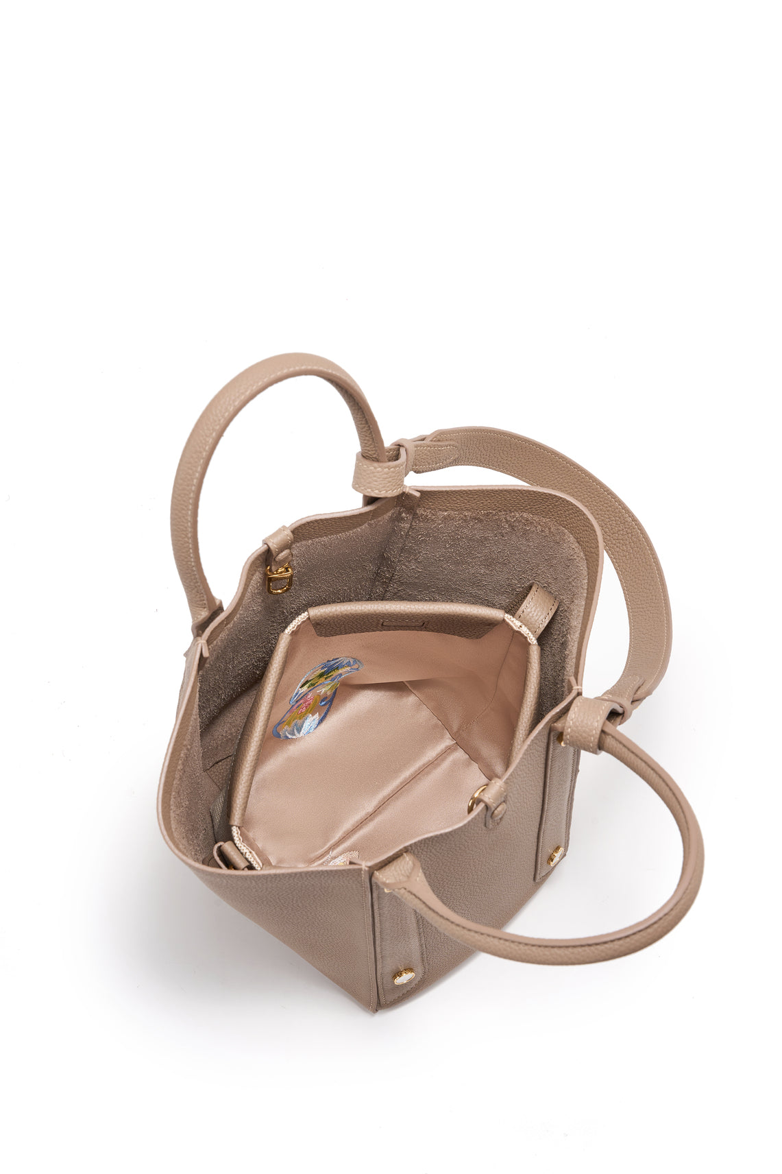 The leather at the opening of the inner bag is made of the same top layer of cowhide as the outer bag. The outer fabric is natural cotton and linen fabric. The inner is made of Suzhou embroidery brocade. The embroidery is inspired by the painting of flowers and butterflies in Song Dynasty calligraphy and painting. There are 20 different shapes of flowers and butterflies in total,  so that the each bag has an unique inner pocket.